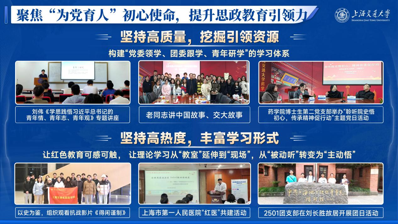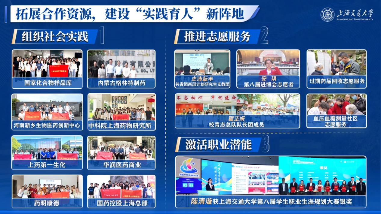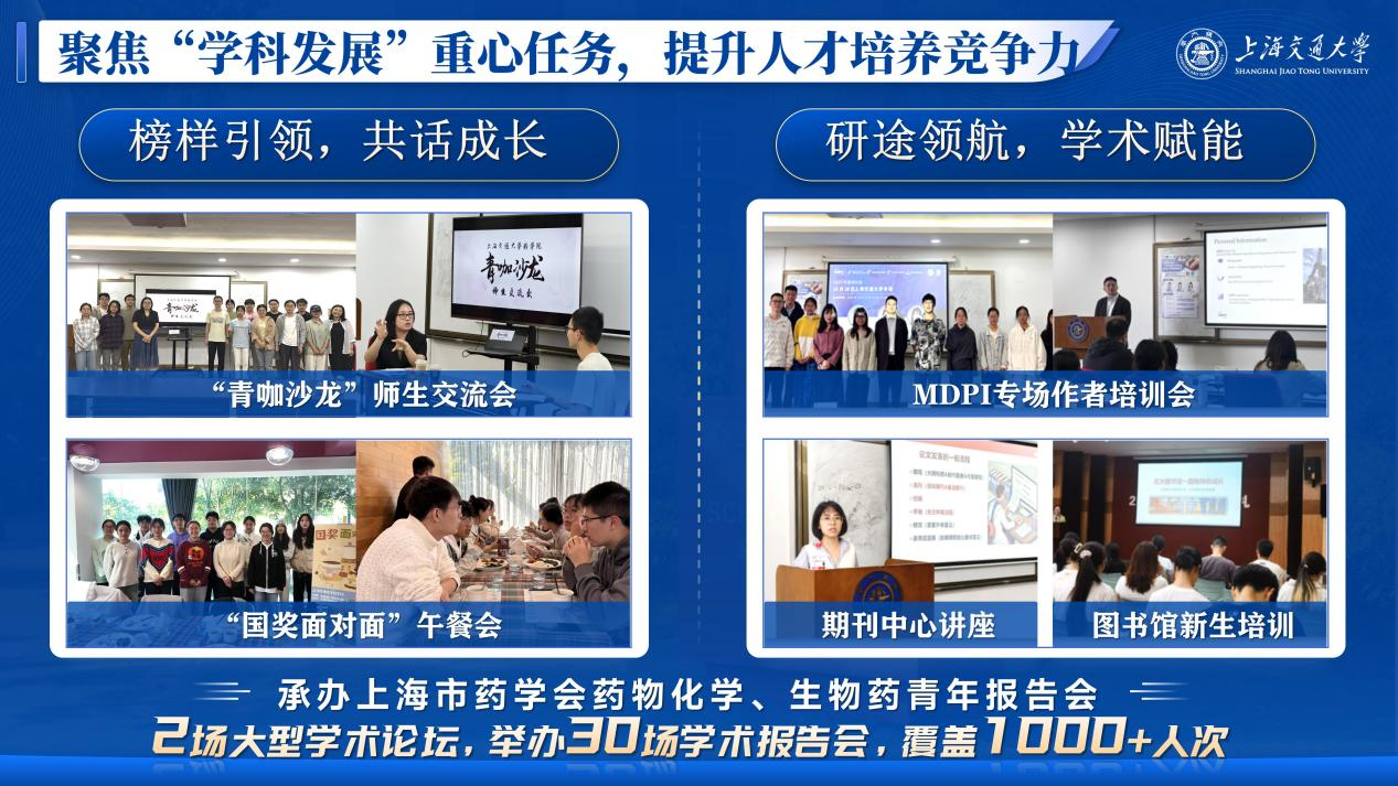 2. 面向药学专业特色,打造“专业育人”新名片围绕万象城awcsport官网学科、学生特点,开展“靶向”人才培养质量提升计划。贯彻“学在交大”主旋律,营造万象城awcsport官网“勤学、好学、乐学、互学”的学习氛围,整合校内外优质资源,打造高品质学术交流系列活动。承办上海市药学会药物化学、生物药青年报告会2场大型学术论坛,举办30场学术报告会;开展“学术赋能工作坊”“青咖沙龙”“国奖面对面”午餐会等活动,通过多样化科研引导,助力研究生提升学术素养;组织期末打卡集体自习活动,激发学生自主学习、比学赶超的积极性;举办升学经验分享会,邀请优秀学长学姐分享出国、保研经历;结合生源来源分析学业困难群体特点,日常开展有一对一的心理帮扶,考试周开展硬课、难课学业辅导和课程答疑,全方位为学生学业保驾护航。