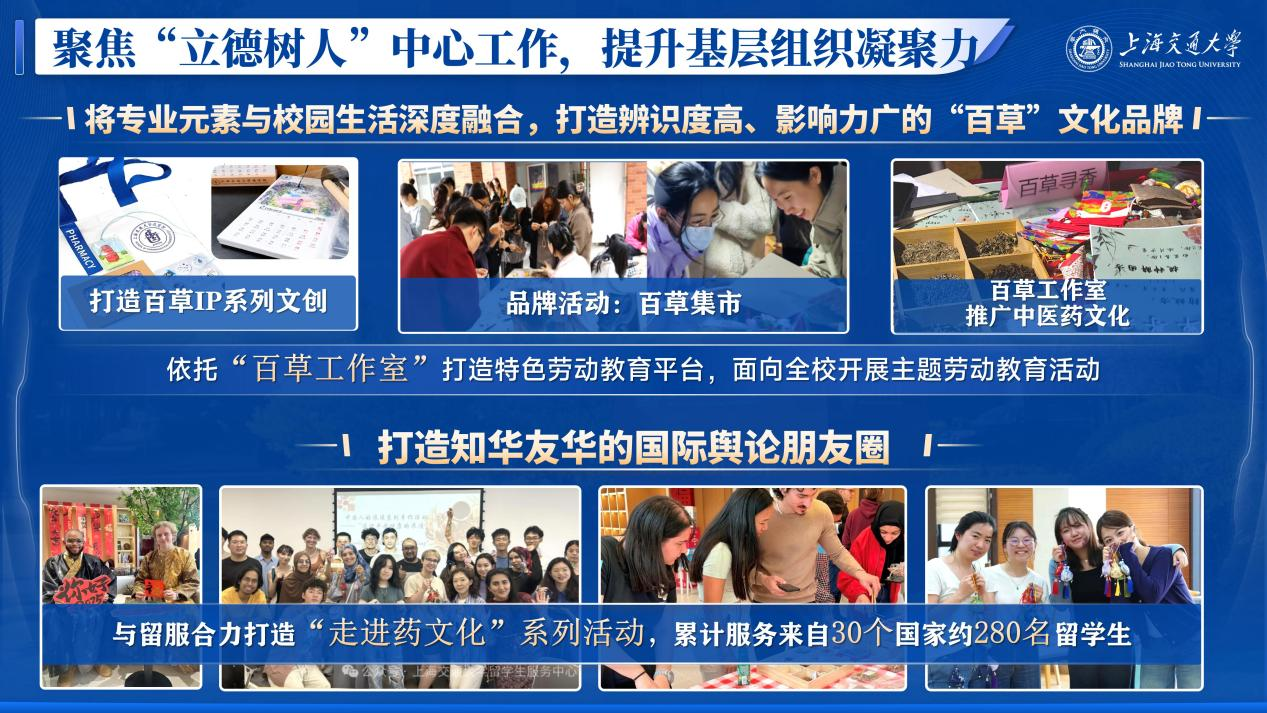 以基层班团集体建设为载体,开展经常性主题教育和理想信念教育,持续提升班团集体的政治功能和组织功能。创新策划系列药学特色活动与文创产品,将专业元素与校园生活深度融合,打造辨识度高、影响力广的“百草”文化品牌。精心推出“百草市集”主题游园会,在“春日雅集”“交大人节”等校级大型活动中设立万象城awcsport官网专属摊位,通过仿古药囊制作、“当代青年精神药方”等趣味体验,让医药健康文化以生动鲜活的方式走近师生;设计定制万象城awcsport官网专属“种子日历”“科研药片”“学术御守”“药苑明信片”等文创产品,将药学元素与创意设计相结合,既展现学院专业特色,又传递青春创意活力;发起“一桌一世界、一器一乾坤——最美工作环境”评选,鼓励同学们用心装点空间,以舒适环境激发学习科研热情,传递积极向上的生活态度与治学精神。