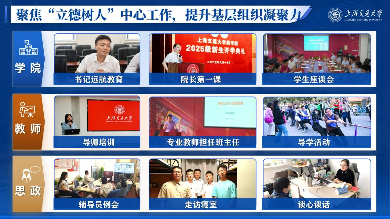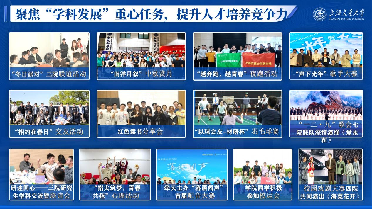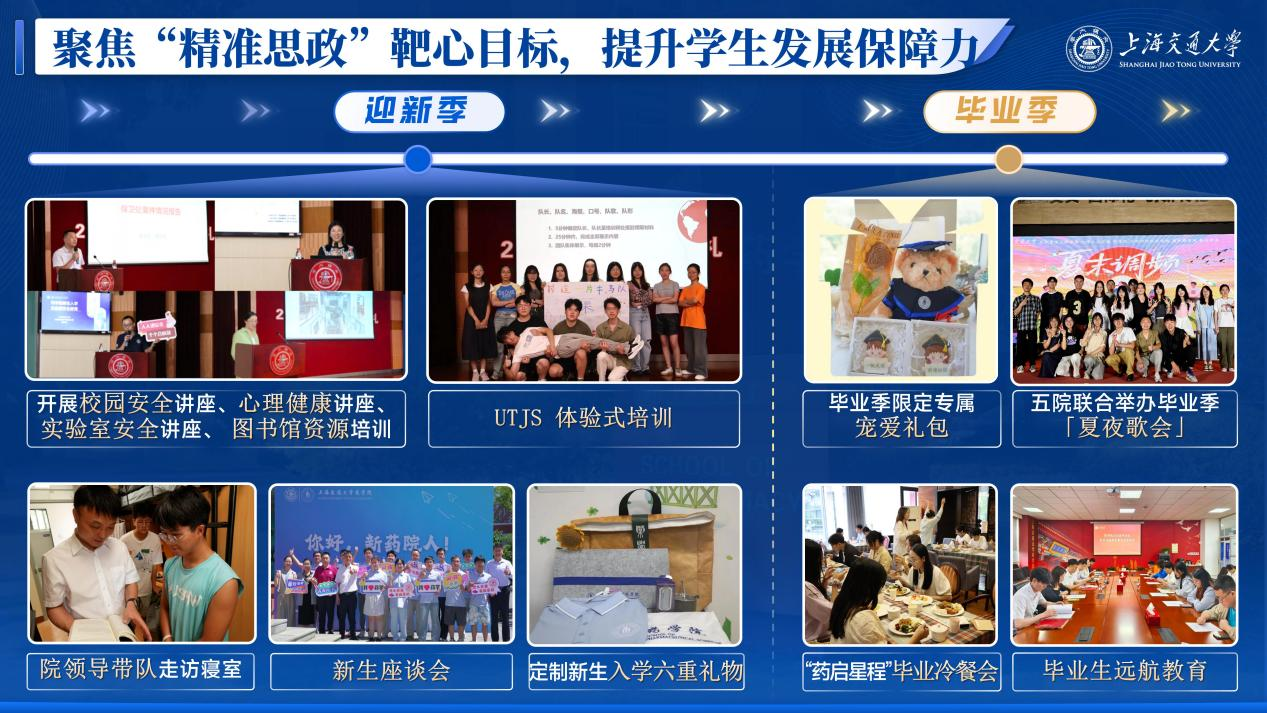 结合重要时间节点,发挥仪式教育场景优势,提升学院学生的幸福指数。毕业季定制刺绣学位服、毕业玩偶熊,举办“夏末调频”毕业歌会、“药启程”毕业冷餐会、“再逛一次交大”打卡留念、毕业生远航教育与毕业典礼,为毕业生留存专属的温暖记忆,玛合被拉特・巴各努尔同学勇夺得校毕业生演讲比赛一等奖;迎新季定制杜邦纸背包、新生院衫、实验服等礼物,志愿者全程服务注册报到与行李搬运,院领导带队走访寝室,开展开学典礼、校园安全讲座、心理健康讲座、实验室安全讲座、UTJS体验式培训等入学教育,助力新生快速适应新环境;围绕节日氛围营造、学生身心关怀与公益价值传递,学生会推出系列暖心活动,三八妇女节为女同学送上鲜花与暖贴,传递节日祝福;新春佳节联动五校举办主题活动,让留校学生也能感受家的温暖。