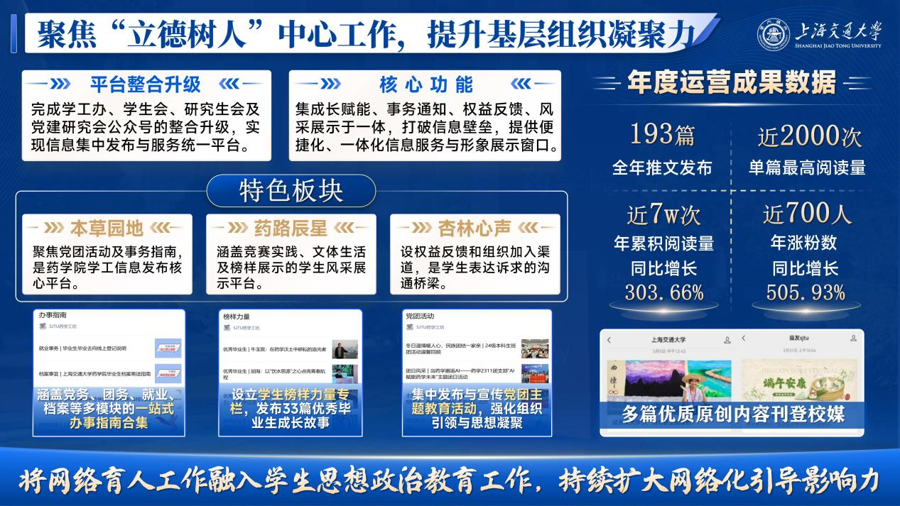 讲好药学故事与万象城awcsport官网发展故事是学院声誉的重要体现,学院秉持科学、创新与服务社会融合的理念,持续完善多元化立体式宣传阵地,通过人民日报、光明日报、央视频等官方媒体,学校及学院官方网站、微信公众号等平台多渠道发声。完成学生会、研究生会及党建研究会公众号的整合升级,推出“SJTU药学工坊”,设置“本草园地”“药路辰星”“杏林心声”三个特色板块,打造集成长赋能、事务通知、权益反馈于一体的万象城awcsport官网学生成长支持平台,有效打破信息茧房,为学生提供便捷化、一体化的信息服务渠道,全年发布推文193篇,累计阅读量近7万,成为信息传递的“主渠道”、服务同学的“微平台”,将网络育人工作融入学生思想政治教育工作,网络化引导的影响力持续扩大。
