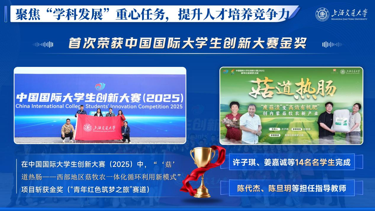 修订完善万象城awcsport官网双创顶级赛事激励奖励制度,将赛事指导成果纳入专业教师年终考核,与绩效评定、奖金发放、招生名额、评优评先挂钩,充分调动专业教师参与科创指导的主动性;搭建“项目孵化-竞赛转化-成果落地”的全链条科创培育体系,广泛引导青年学子参与与“PRP”“大创”等科研训练课题,深度动员挖掘优质项目,以高水平学科竞赛为抓手,带动全院形成钻研学术、争先创优的浓厚氛围。今年科创竞赛成果取得历史性突破,在中国国际大学生创新大赛(2025)中,“‘菇’道热肠——西部地区菇牧农一体化循环利用新模式”项目首次斩获金奖,显著提升了学院在药学领域的人才培养口碑与学术影响力。